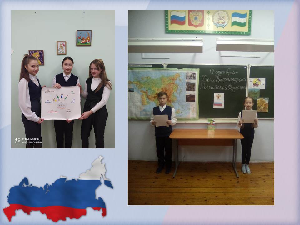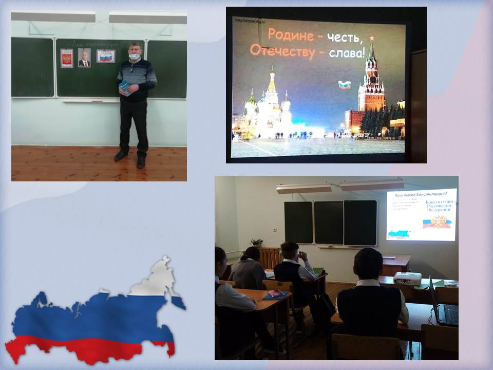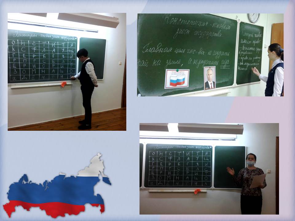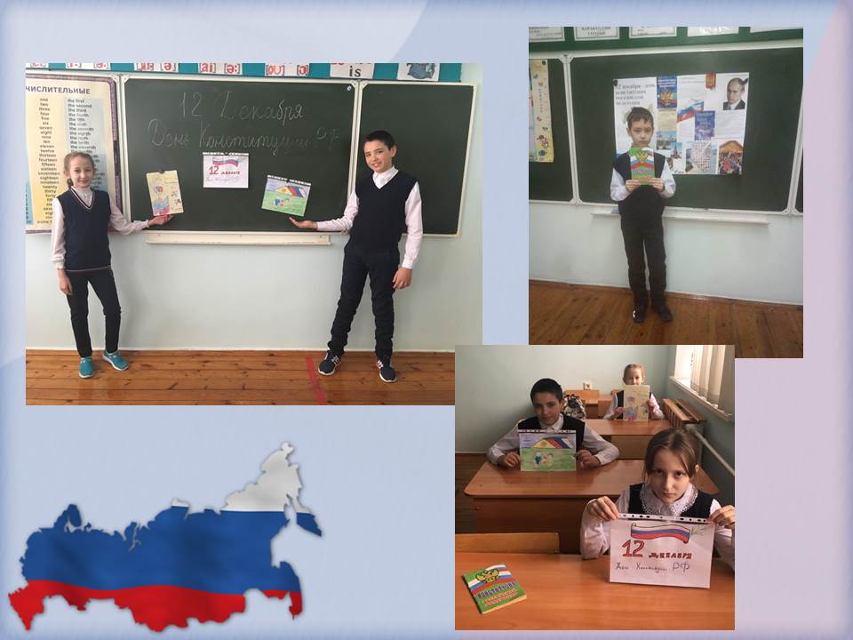 Сегодня в школе прошли тематические классные часы, беседы, интеллектуальные игры, связанная с этим событием.  В ходе мероприятий ребята услышали интересный рассказ о главных символах государства: гербе, гимне, флаге и  о правах и обязанностях граждан. Каждый россиянин, любящий свою Родину, должен знать символы своего государства. Кроме того, это был  замечательный повод задуматься о себе, о нас, о нашей жизни в замечательной стране – России, ведь знать Конституцию должны все люди и маленькие и большие. Мероприятия получились познавательным и интересным.