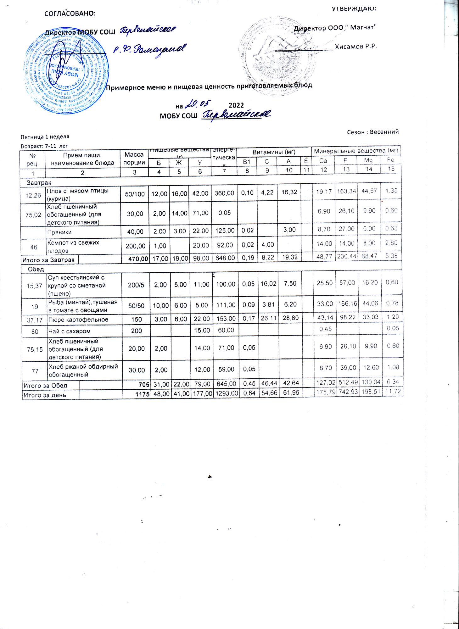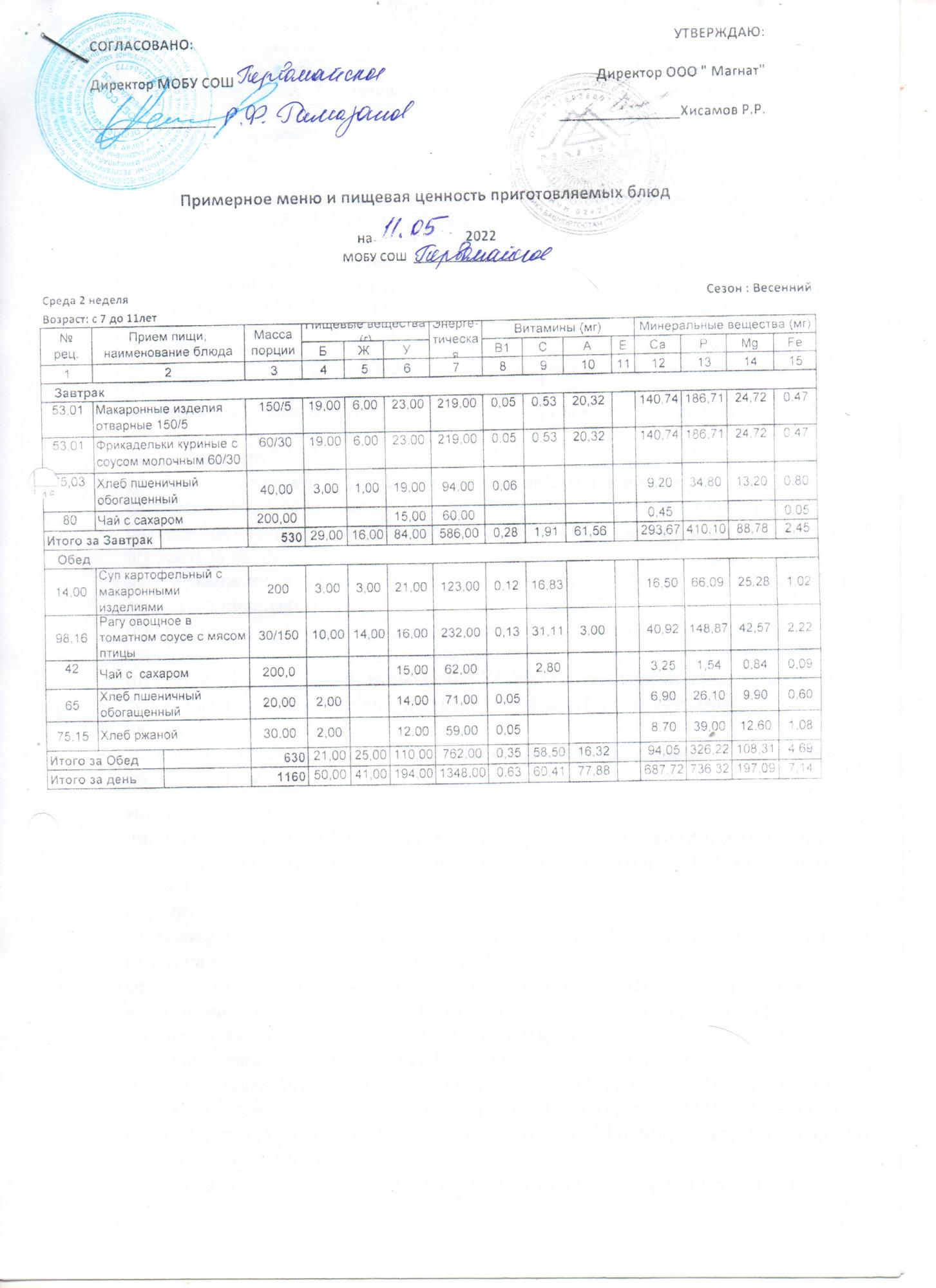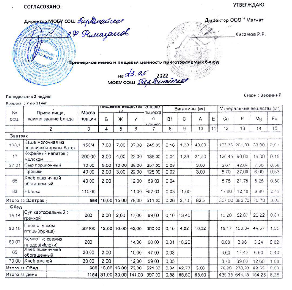 (Контрольные блюда)