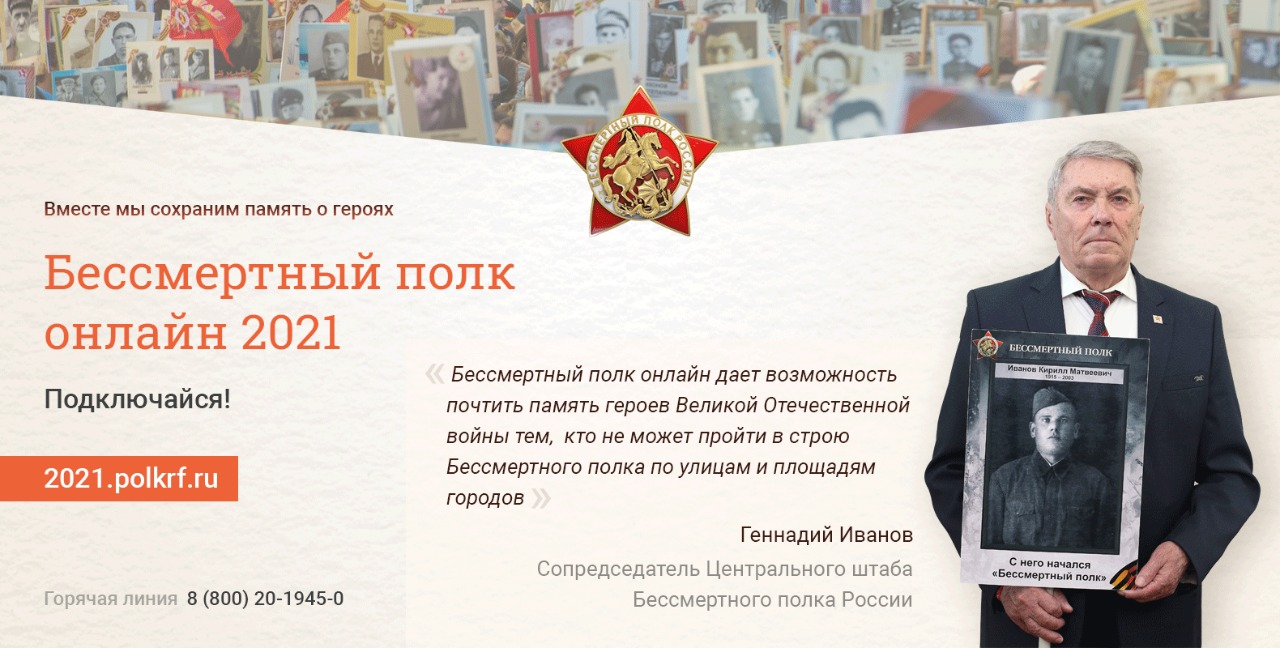 Мы чтим и бережно храним память о подвиге наших героев. В этом году мы снова проведем шествие Бессмертного полка в онлайн формате. Расскажите о своем герое и примите участие в шествии «Бессмертный полк Онлайн».